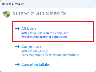セットアップファイルを起動すると、インストールが開始されます。環境にあった項目を選択。(All Users)を選択した