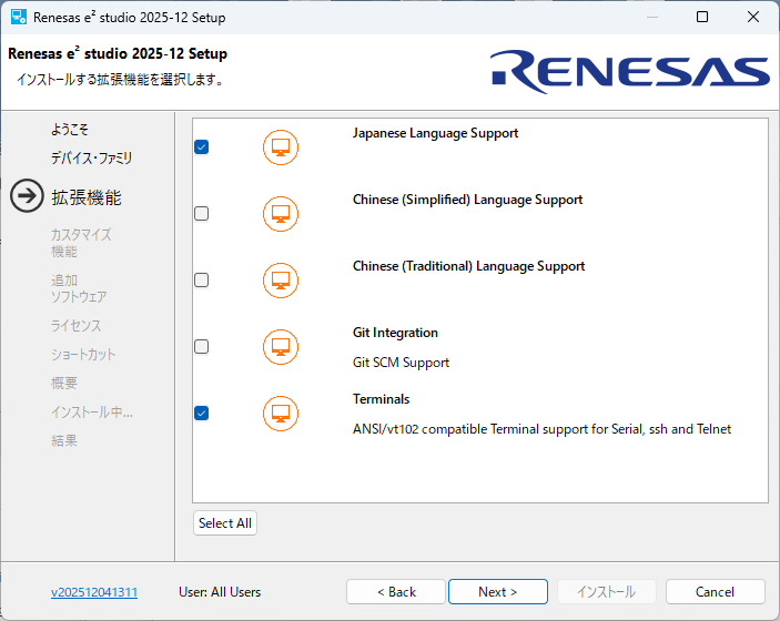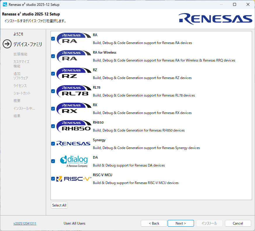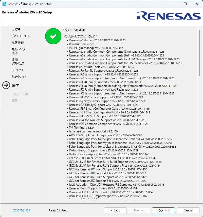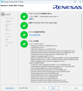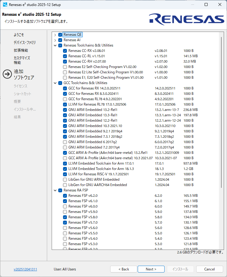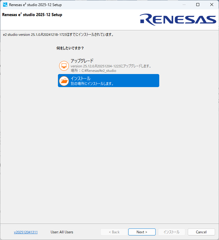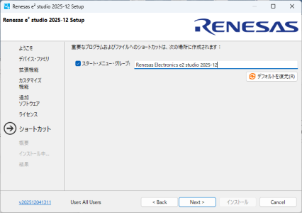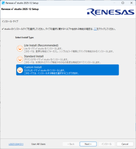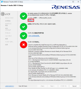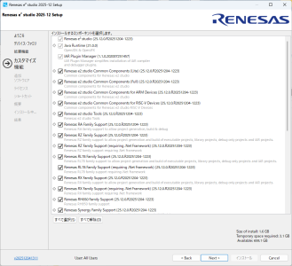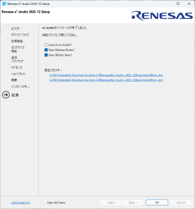 e2studio (IDEとコーディングツール) の必要なバージョンを「https://www.renesas.com/ja/software-tool/e2-studio」から探してダウンロードします。ダウンロードしたファイルは圧縮ファイルなので解凍してセットアップファイルを実行します。