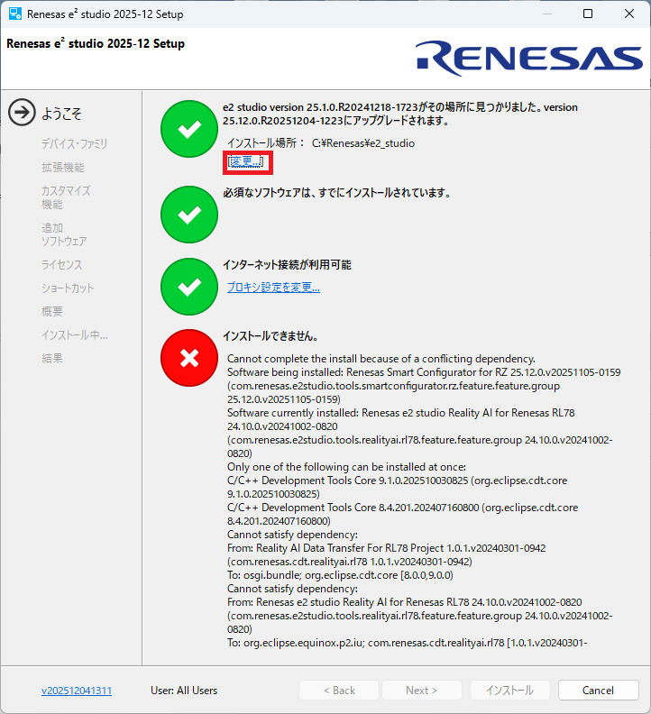デフォルトの状態でチェックが始まり、エラーが出たので「インストール場所」の変更をしました。