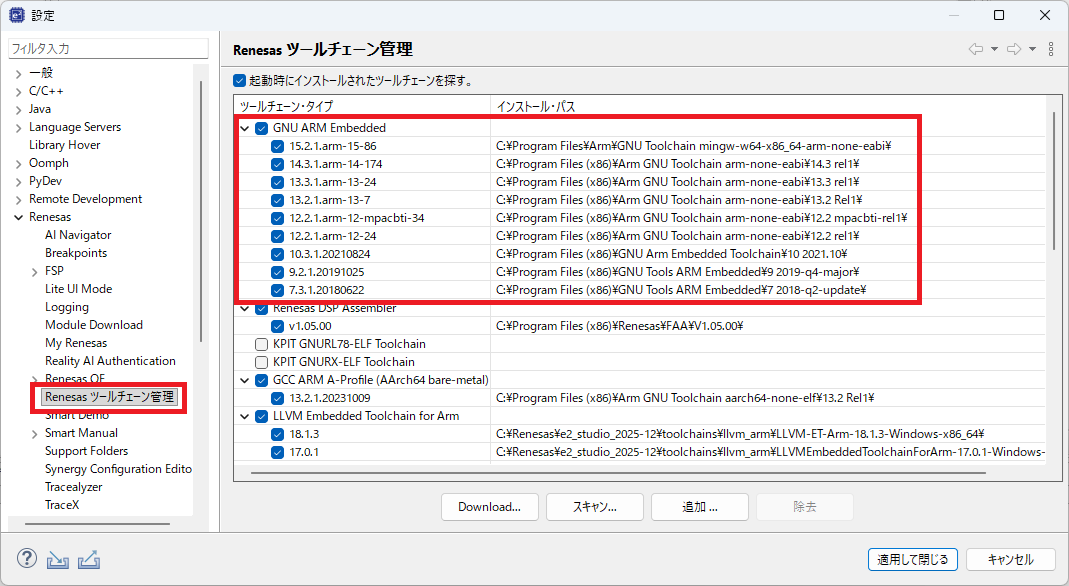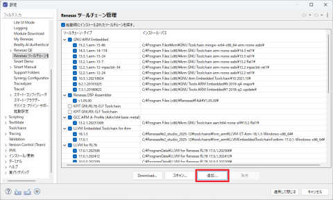 ツールチェンをインストール後、e2Studio がツールチェンを認識しているか確認します。確認は、e2Studio の「ヘルプ」から「Renesasツールチェーンの追加」 にて「ツールチェン管理」を選択するとインストール済みのツールチェンが現れますが、インストールしたはずのツールチェンが表示されていない場合は、デフォルトのフォルダにインストールされていない可能性があるので、「追加」にてツールチェンをインストールしたフォルダを選択し利用できるようにしました。フォルダ「C:\Program Files (x86)\Arm GNU Toolchain arm-none-eabi」にインストールされたツールは認識するようですが、「.msi」でインストールし、フォルダ「C:\Program Files\Arm\」に導入されたツールチェン「15.2」は見えていなかったので、「追加」にてフォルダを選択してe2Studio から利用できるようにした。